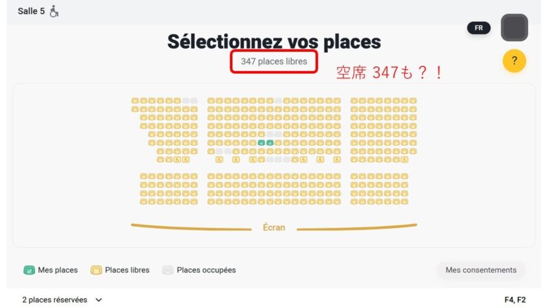 残り347席が空席。公開2週目なのに!?と思いつつも、地方都市Mâconではアニメの観客層はまだ限られているようです。