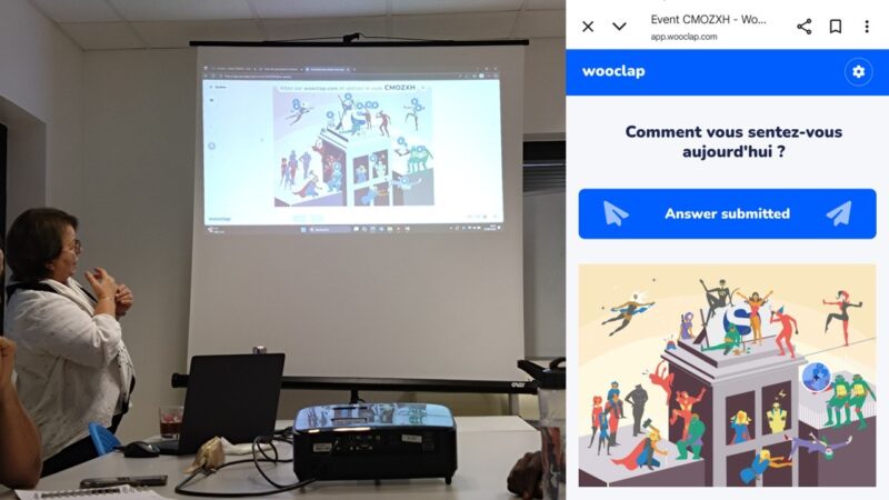 スマホで Wooclap というアプリにアクセスして、今の気持ちを一番表すキャラクターを選ぶというゲーム。