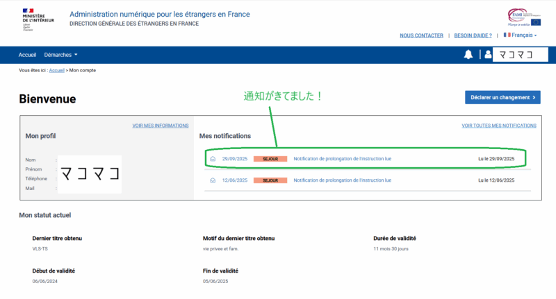 メールの案内に従い、滞在許可申請の Webサイト に入ると、確かに新しい通知が届いていました。