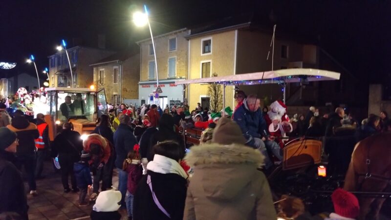 先頭は馬に乗った Père Noël(サンタクロース)とその馬車、続いてトラクターと荷台に子どもたちが分かれて乗車します。